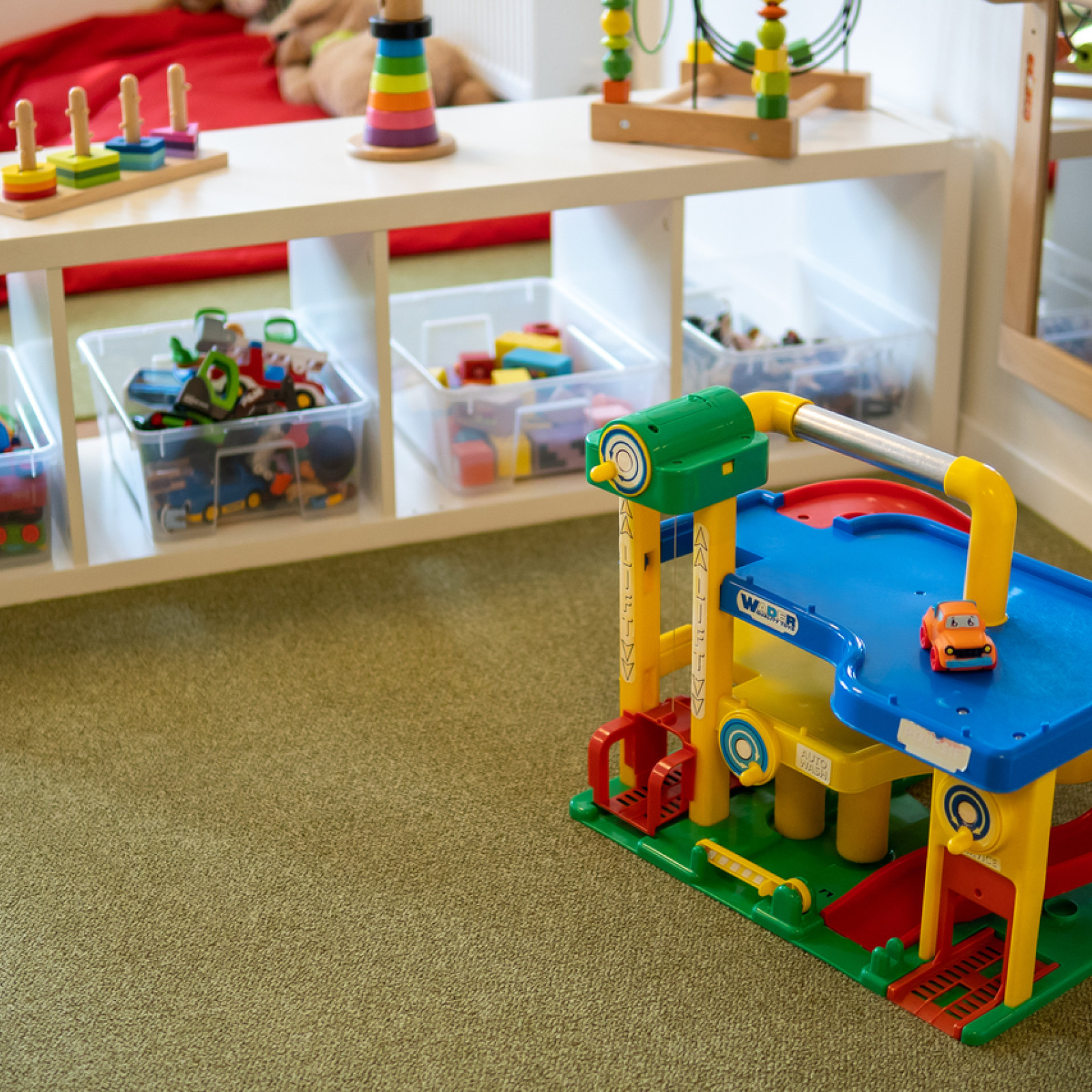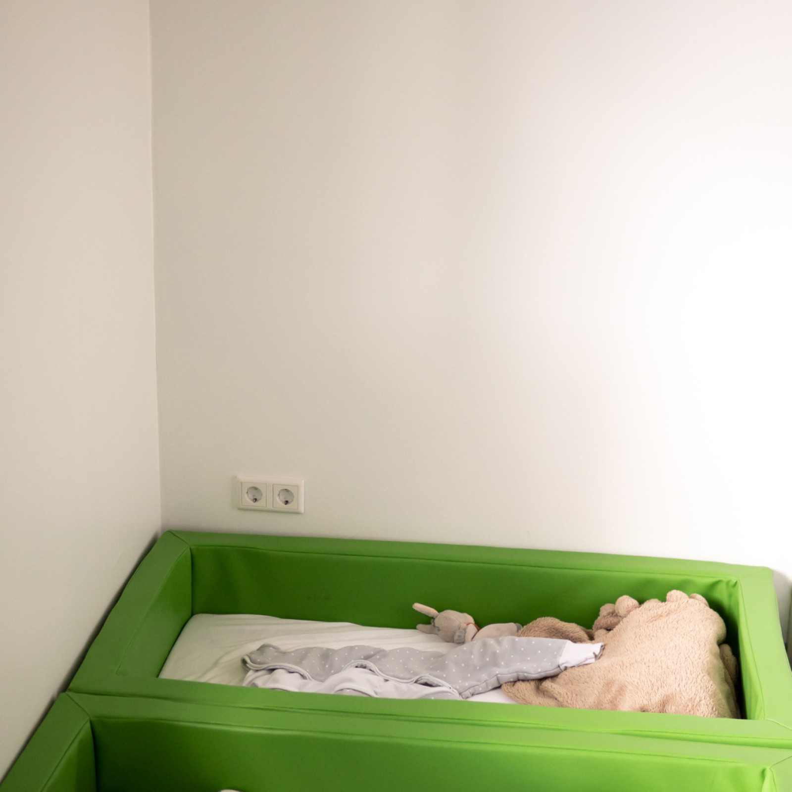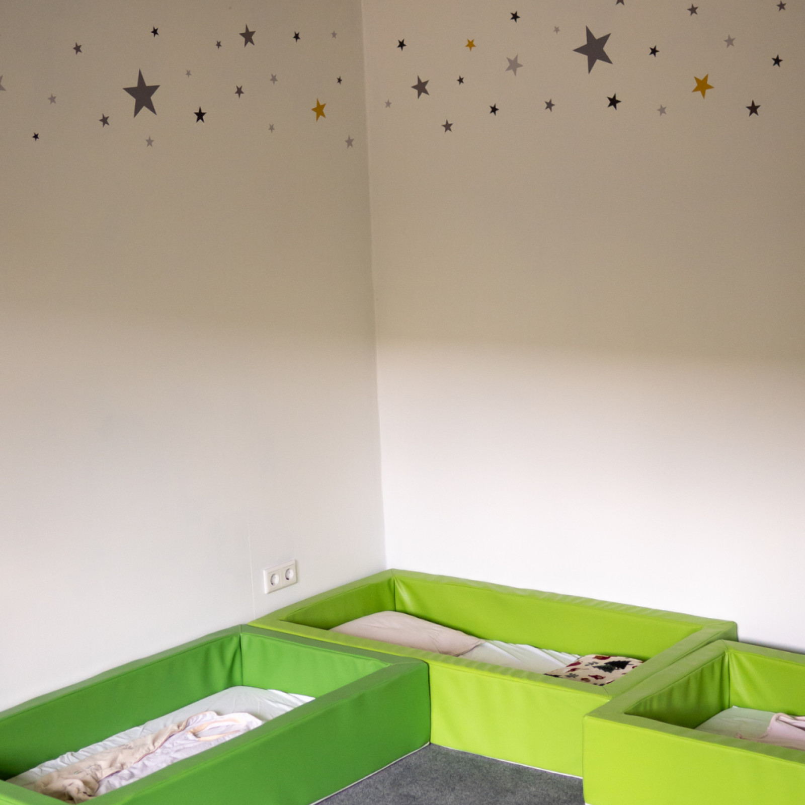 Im Schlafraum hat jedes Kind sein eigenes Bett, wo es sich von den Eindrücken des Tages erholen kann. Das große Spielzimmer bietet viele Möglichkeiten zum Spielen, Toben und Erkunden. Ein weiterer Raum wird für verschiedene Angebote genutzt. Im kindgerechtem Essbereich wird mit den Kindern gemeinsam gekocht und gegessen.
