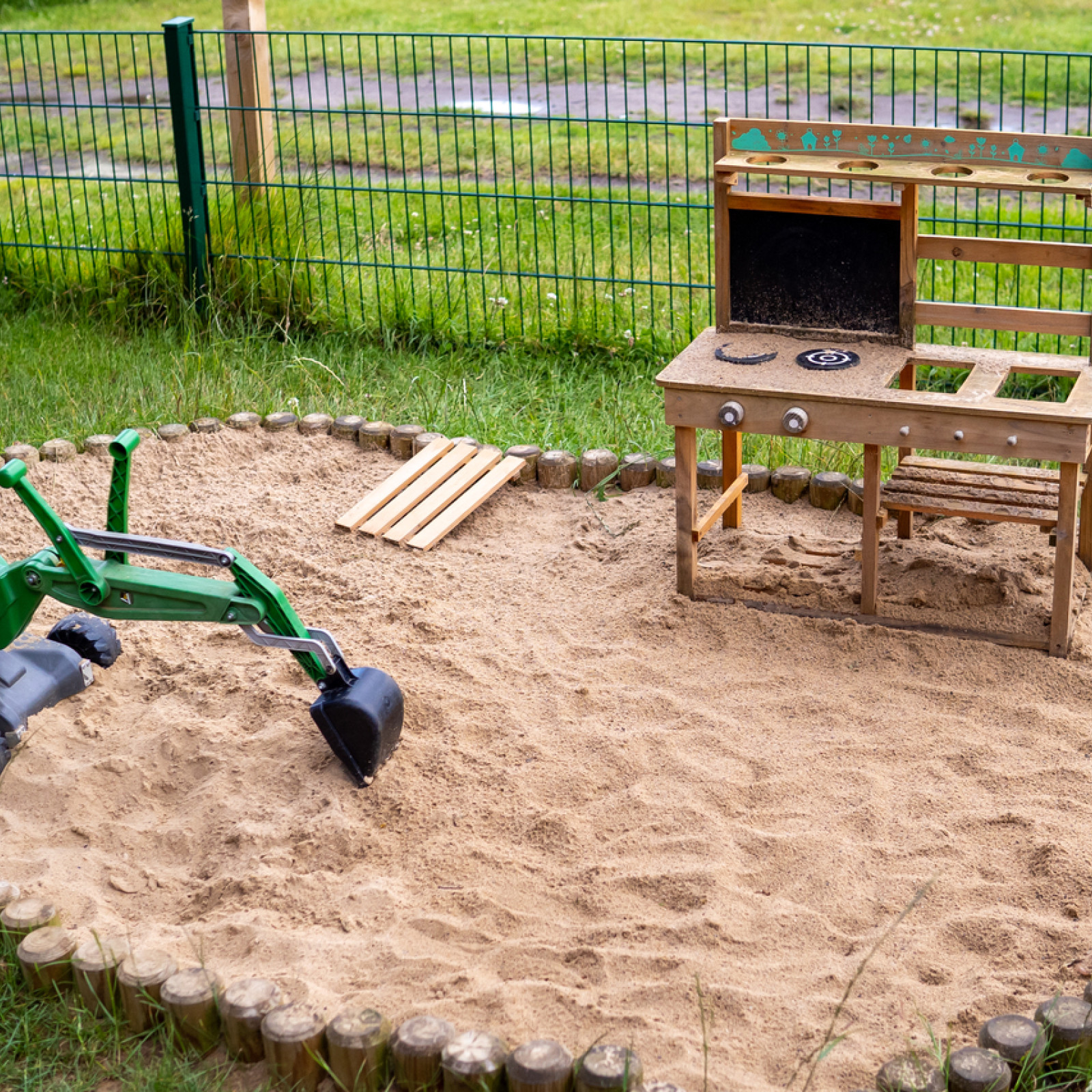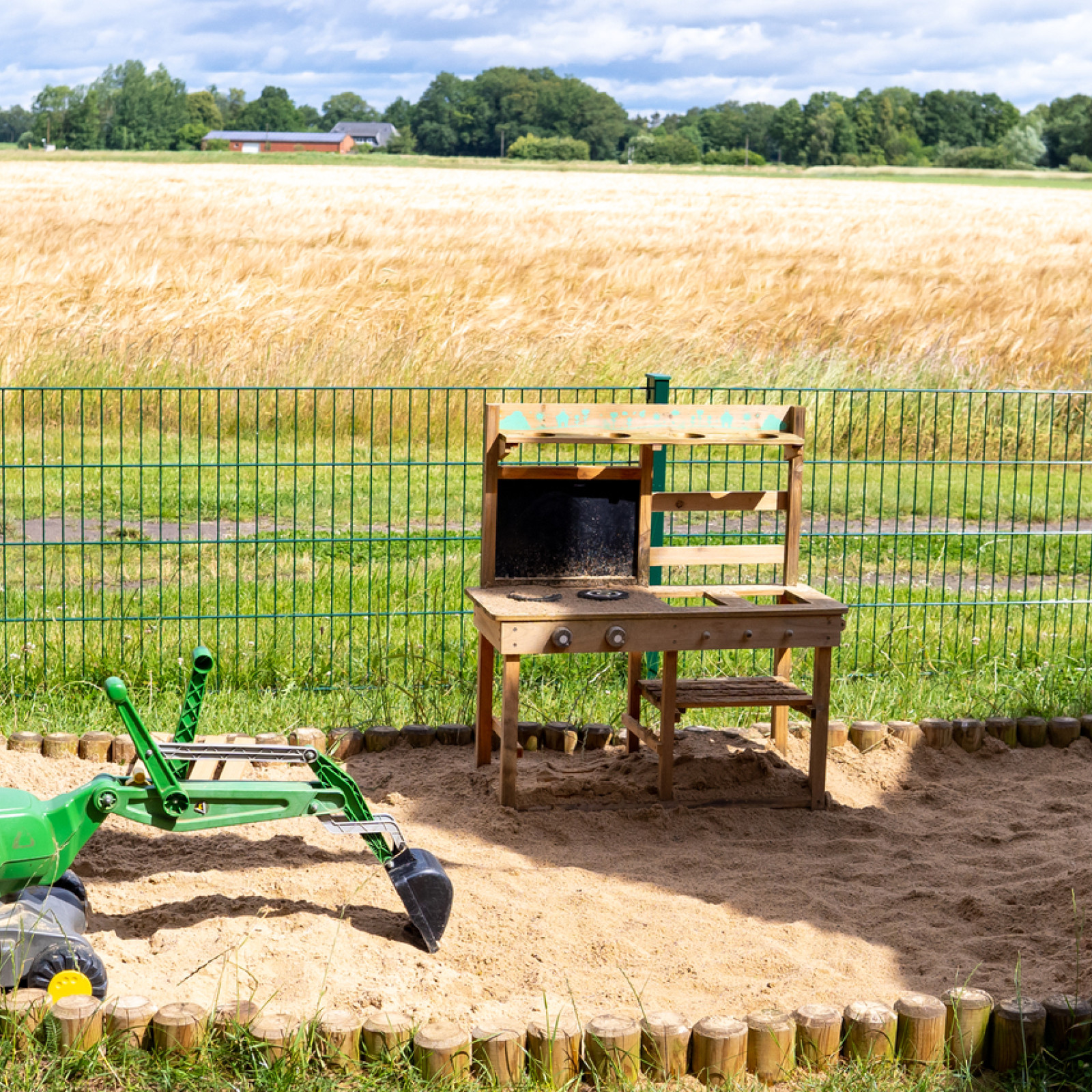 Draußen können sich die Kinder auf dem Spielplatz oder auf den Feldwegen frei bewegen. Außerdem gibt es verschiedene Tiere, wie den Hund Paul, Kaninchen, Hühner und Schildkröten zu versorgen.